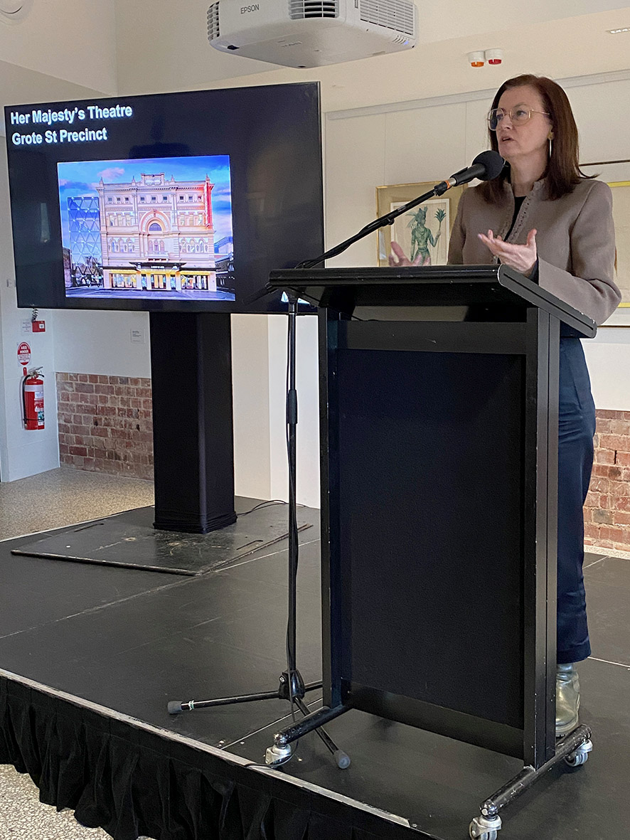 Guest speakers Kate Gould, CEO Adelaide Festival Centre and Fabienne Reilly GM Adelaide Central Market Authority attracted a good attendance at Grote Business Precinct Annual General Meeting held at Her Majesty's Theatre on Grote Street.